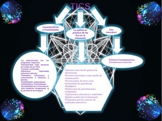 El documento describe las características y posibilidades educativas de las tecnologías de la información y la comunicación (TIC). Destaca la interactividad, el carácter multimedia, la estructura hipermedia y las posibilidades colaborativas y de comunicación a distancia que ofrecen las TIC. También menciona algunas herramientas TIC útiles para la educación como Internet, correo electrónico, procesador de texto, WebQuest y presentaciones multimedia.