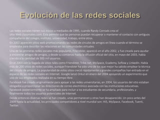 Las redes sociales son comunidades virtuales donde las personas interactúan con otras que comparten intereses. Permiten conectar a personas que se conocen o desean conocerse, y centralizar recursos como fotos y videos. Algunas de las primeras redes populares fueron Classmates.com en 1995, Friendster en 2002 y Facebook en 2004, originalmente para universidades. Las redes sociales han crecido rápidamente y permiten mantenerse conectado con amigos, comunicarse y estar actualizado.