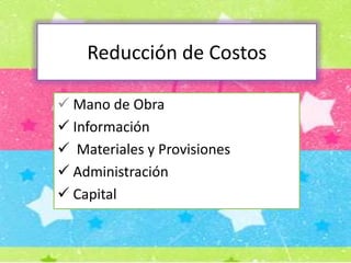 Este documento trata sobre la reducción de costos en diferentes áreas como la mano de obra, información, materiales, administración y capital. Explica que la reducción de costos consiste en detectar, prevenir y eliminar el uso excesivo de recursos sin afectar la calidad. Propone reducir costos a través de programas de reubicación, transferencia y reentrenamiento del personal, así como optimizando procesos, documentos y almacenamiento para reducir gastos en información y materiales. También sugiere analizar procesos administrativos y financier