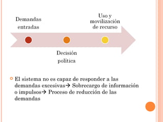 Este documento describe cómo los sistemas políticos reducen la demanda cuando no pueden responder a todas las solicitudes. Primero, filtran las demandas para seleccionar aquellas que son más pertinentes, posibles de responder y de mayor poder político y social. Luego, clasifican las demandas restantes por importancia y urgencia para derivarlas a los órganos correspondientes. Finalmente, tratan de combinar demandas para agilizar el proceso y minimizar el número de solicitudes.