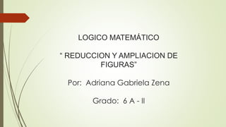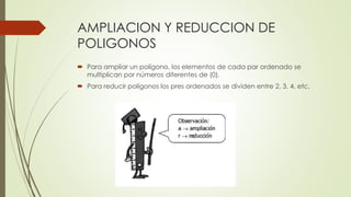 El documento explica cómo ampliar y reducir polígonos mediante operaciones matemáticas. Para ampliar un polígono, los lados y ángulos se multiplican por un número distinto de cero. Para reducir un polígono, los lados y ángulos se dividen entre números enteros como 2, 3 o 4.
