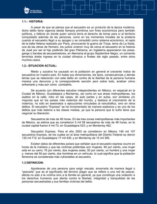 El documento describe la situación actual del secuestro en México, incluyendo estadísticas sobre los diferentes tipos de secuestro. Analiza factores como la falta de políticas públicas homogéneas, la necesidad de cooperación internacional para capacitar fuerzas policiales, y la rehabilitación penitenciaria inadecuada que contribuye al aumento de este delito. Finalmente, propone una política de estado integral para reducir la criminalidad relacionada con el secuestro.