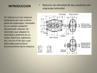 El documento describe el diseño y estudio de un reductor de velocidad de dos escalones con engranaje helicoidal, que adapta la velocidad y potencia de un motor. Los objetivos incluyen la creación de hojas de ruta, mantenimiento y planos, y se destaca la eficiencia, seguridad y espacio óptimo que ofrece el reductor. El proyecto no tendrá costo de diseño, pero se ofrecerá un presupuesto real para su fabricación.