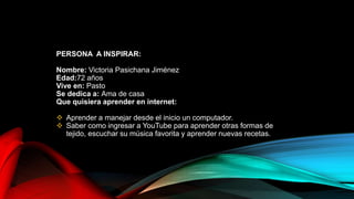 Este documento describe cómo dos personas mayores, Victoria y Carlos, aprendieron a usar la tecnología a través del proyecto Redvolución. Victoria aprendió a encender una computadora y usar YouTube para aprender nuevas técnicas de tejido. Carlos aprendió a usar su celular para acceder a aplicaciones como YouTube, Google y WhatsApp para comunicarse con familiares. A través de varias sesiones, ambos lograron dominar estas nuevas habilidades tecnológicas.