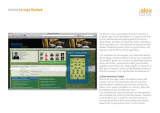 Reebok lanzará una nueva liga amateur llamada La Liga Reebok para apoyar a los aficionados al fútbol entre 15-35 años. La Liga Reebok será una plataforma en línea donde los equipos y jugadores aficionados puedan crear perfiles, publicar resultados de partidos y fotos, y conectarse con otros fanáticos del fútbol. Reebok promoverá la liga contactando a administradores de campos de fútbol para que utilicen la herramienta y la difundan, y premiando al primer equipo regist