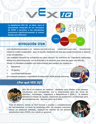 El documento describe el sistema de robótica educativa VEX IQ, el cual es ideal para la enseñanza de conceptos STEM a estudiantes de primaria y secundaria. VEX IQ ofrece kits flexibles con instrucciones para proyectos de robótica que involucran a los estudiantes de manera divertida. Los kits permiten diseñar, construir y programar robots utilizando piezas de plástico sin herramientas. VEX IQ también ha impulsado competencias de robótica que han inspirado a miles de estudiantes.