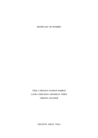 El documento describe la anatomía del hombro, incluyendo los huesos, ligamentos, tendones y músculos que lo componen. También explica el proceso de artroplastia de hombro, que implica reemplazar la articulación dañada del hombro con prótesis, ya sea reemplazando solo la cabeza del húmero (hemiartroplastia) o ambos componentes (artroplastia total). Finalmente, detalla los diferentes tipos de prótesis de hombro disponibles, incluyendo las diferencias en materiales, fijación