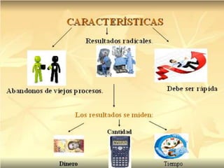 El documento habla sobre la reestructuración y reingeniería organizacional. Explica que la reestructuración implica reducir el tamaño de una empresa mediante despidos, mientras que la reingeniería se enfoca en rediseñar procesos sin afectar la estructura o personal. También describe los pasos de la reingeniería de procesos y algunos beneficios y desafíos de la reestructuración.