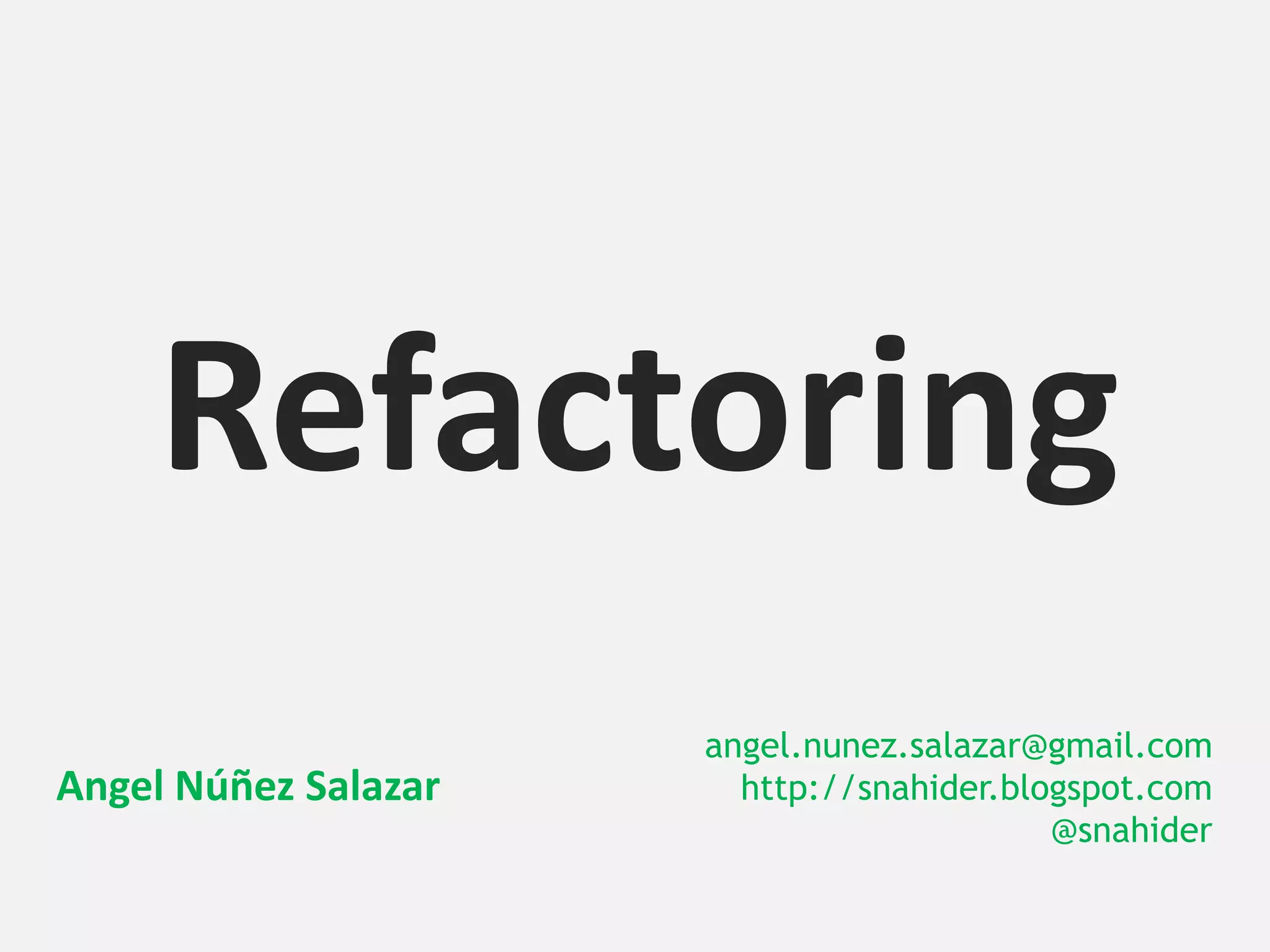 Refactoring es una técnica para mejorar la estructura interna del código sin cambiar su comportamiento. Es importante refactorizar código que sea poco entendible, duplicado o muy complejo para facilitar futuras modificaciones y agregar funcionalidad de manera más eficiente. Las herramientas de los IDEs pueden ayudar a realizar rápidamente ciertas transformaciones de refactorización. Los "code smells" sirven como señales para identificar parte del código que se debe refactorizar.