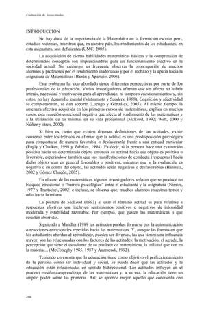 Este estudio evaluó las actitudes hacia las matemáticas y el rendimiento académico de 1220 estudiantes de educación secundaria en España. Los resultados mostraron que las actitudes hacia las matemáticas correlacionaron con el rendimiento académico, es decir, actitudes más positivas se asociaron con un mejor rendimiento. También se encontraron diferencias significativas en las actitudes dependiendo del tipo de escuela, siendo las actitudes más positivas en escuelas privadas.