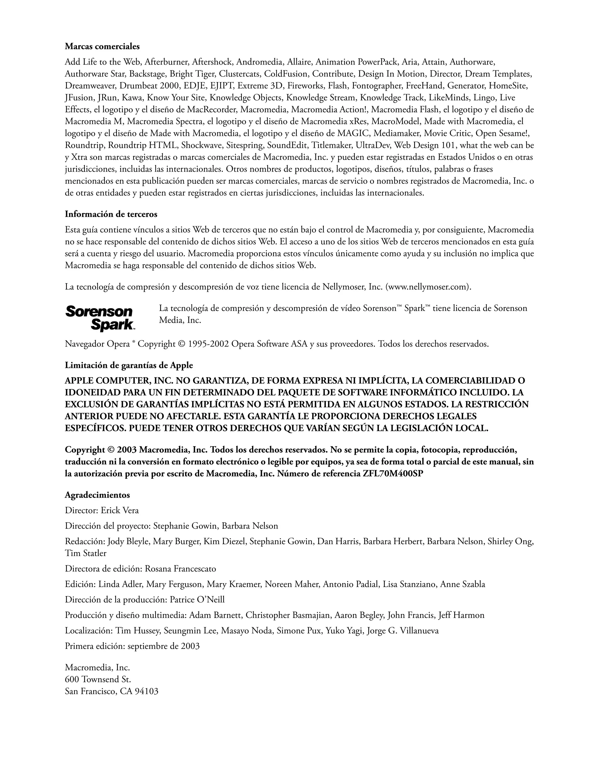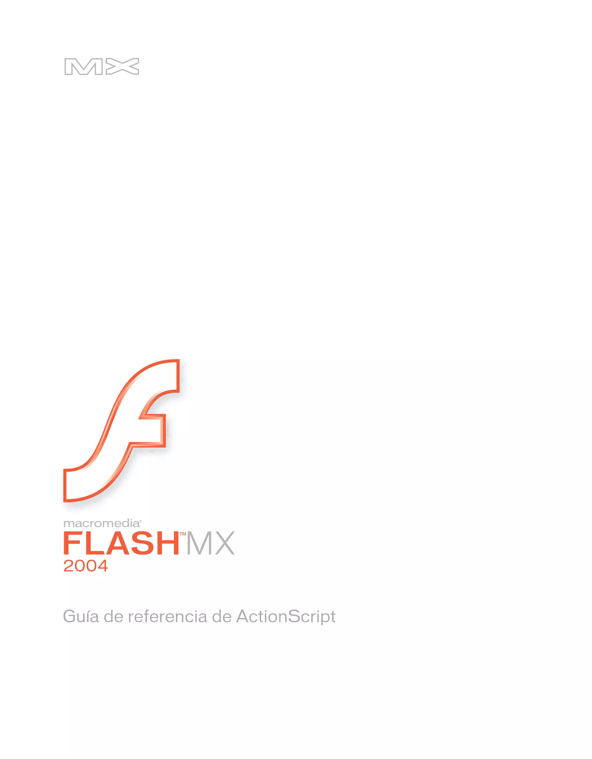 Este documento proporciona una guía de referencia sobre ActionScript. Incluye información sobre marcas comerciales, créditos, contenido y limitaciones de garantías. Explica los nuevos elementos de lenguaje de ActionScript en Flash MX 2004, así como cambios en el editor, la depuración y el modelo de programación orientada a objetos.