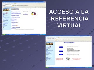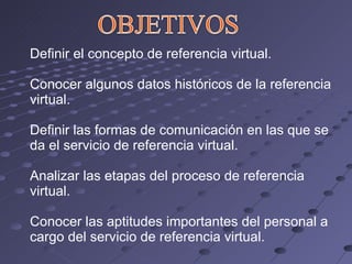 El documento define la referencia virtual y su historia, describe los métodos de comunicación, las etapas del proceso de referencia virtual, las habilidades necesarias del personal, y consideraciones para establecer el servicio. También menciona ventajas y desafíos, proveedores como QuestionPoint, y cómo funciona este servicio de referencia virtual.