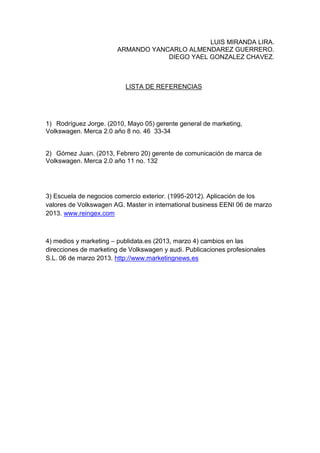 Este documento presenta una lista de 4 referencias relacionadas con Volkswagen AG. La primera referencia es un artículo de 2010 sobre el gerente general de marketing de Volkswagen. La segunda referencia es un artículo de 2013 sobre el gerente de comunicación de marca de Volkswagen. La tercera referencia es sobre la aplicación de los valores de Volkswagen AG en una maestría. La cuarta referencia es sobre cambios en las direcciones de marketing de Volkswagen y Audi.