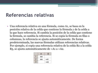 Este documento explica los tres tipos de referencias en Excel: referencias relativas, absolutas y mixtas. Las referencias relativas se ajustan automáticamente cuando se mueve o copia la fórmula, las absolutas permanecen fijas, y las mixtas tienen una parte fija y otra ajustable.