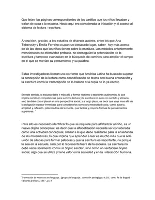 El documento discute las teorías sobre la enseñanza de la lectura y la escritura. Argumenta que estos procesos deben enseñarse como actividades conceptuales, no solo reglas lingüísticas. También destaca la importancia de que los estudiantes vean la lectura y escritura como actividades placenteras y sociales, no solo escolares. Finalmente, enfatiza que los maestros deben ofrecer oportunidades para que los estudiantes construyan y narren sus propios textos.