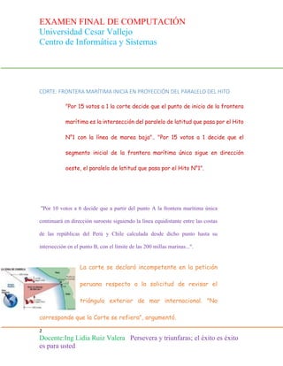 La Corte Internacional de Justicia definió la frontera marítima entre Perú y Chile sin determinar las coordenadas geográficas específicas, esperando que ambos países acuerden esas coordenadas de buena fe. La frontera sigue una línea paralela a la costa hasta las 80 millas y luego continúa en dirección sur hasta un punto antes de las 200 millas.