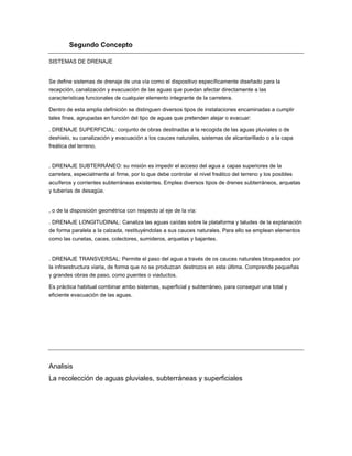 El documento define el drenaje de carreteras como la evacuación de aguas superficiales y subterráneas lejos de la carretera para proteger la inversión, la vida y las propiedades. Incluye estructuras como el pavimento, cunetas y alcantarillas. El drenaje puede ser superficial a través de conductos y alcantarillas, o subsuperficial para eliminar humedad en terraplenes. Adecuado drenaje es necesario para la durabilidad de la carretera y seguridad vial.