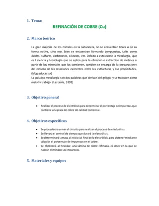 Este documento describe un experimento de laboratorio para refinar cobre mediante electrólisis. Se midió inicialmente la masa de las láminas de cobre comercial y electrolítico. Luego se montó el circuito eléctrico y se aplicó corriente durante 30 minutos, tras lo cual se volvió a medir la masa de las láminas. Los cálculos mostraron que la lámina comercial perdió masa en un 52.14%, mientras que la electrolítica ganó masa. Esto demuestra que la electrólisis permitió refinar el co
