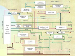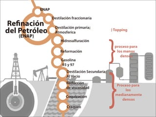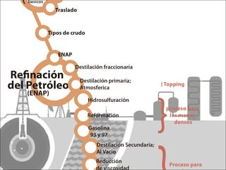 El documento describe el proceso de refinación del petróleo, que convierte el crudo en productos utilizables mediante diversas técnicas como la destilación fraccionaria, hidrodesulfuración y craqueo. ENAP, la principal empresa energética de Chile, desempeña un papel vital en este proceso, produciendo combustibles para diversas aplicaciones. Además, se detalla la importancia del octanaje en la eficiencia de los motores y las diversas etapas del refinado.