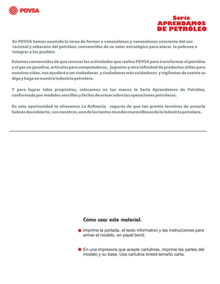 La refinería transforma el petróleo crudo en productos útiles como gasolina, kerosene y aceites a través de un proceso que incluye calentar el petróleo en un horno, destilarlo en torres de destilación para separar los diferentes componentes según su punto de ebullición, y utilizar otros equipos como tanques de almacenamiento, motores, bombas e intercambiadores de calor. El documento proporciona instrucciones para armar un modelo de una refinería con varias piezas recortadas de cartulina.