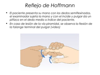 Este documento describe varios reflejos neuromusculares y pruebas para evaluar el tono muscular. Incluye reflejos como el reflejo cubitopronador, reflejo de Hoffmann, reflejo de Mayer, y reflejo del cuádriceps. También describe hipotonías, hipertonías, y metodologías para explorar el tono muscular, como la inspección y las pruebas de pasividad.