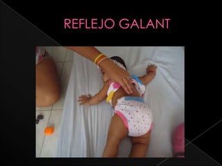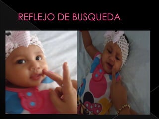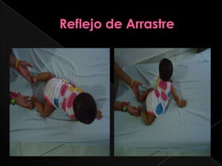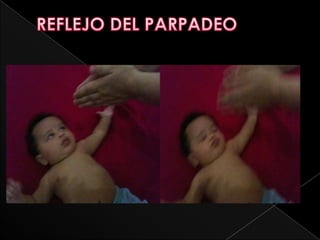 Este documento describe varios reflejos primarios que se presentan en bebés recién nacidos, incluyendo el reflejo prensil, la succión, el parpadeo y el reflejo de Babinski. La mayoría de estos reflejos desaparecen en los primeros meses de vida a medida que el sistema nervioso del bebé se desarrolla.