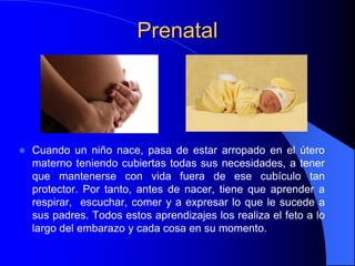 El documento describe las diferentes etapas del desarrollo prenatal y motor de un bebé. Durante el embarazo, el feto desarrolla sus sentidos y capacidad de movimiento, practicando para la vida fuera del útero. Tras el nacimiento, el bebé pasa por etapas como levantar la cabeza, rodar, sentarse, gatear y caminar, desarrollando gradualmente el control motor voluntario a través de la práctica de los reflejos y habilidades motoras.