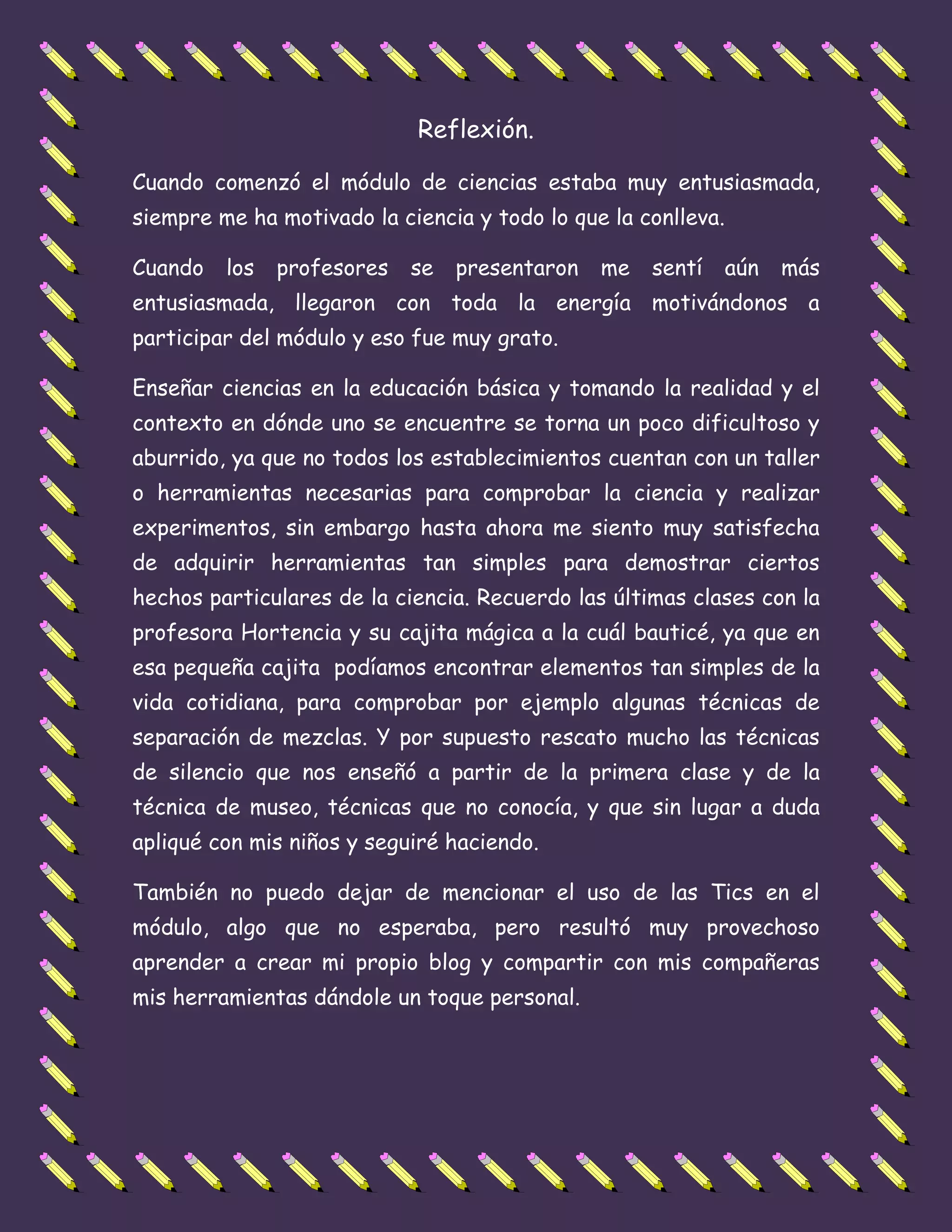 La autora disfrutó el módulo de ciencias y se sintió motivada por los profesores entusiastas. Aunque no todos los establecimientos cuentan con los recursos ideales para experimentos científicos, ella ha adquirido herramientas simples pero efectivas para demostrar conceptos científicos. También aprendió técnicas pedagógicas como la del "museo" y el uso de TIC como blogs, lo que resultó muy provechoso.