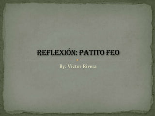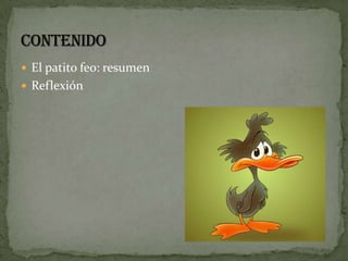 Este resumen describe la historia del patito feo. El patito nació diferente a sus hermanos y fue rechazado por ellos. Tuvo que buscar un nuevo hogar y pasó por muchas dificultades durante el invierno. En la primavera, descubrió que se había transformado en un hermoso cisne cuando vio su reflejo en el estanque. La historia enseña que nunca debemos darnos por vencidos y que nuestra autoestima puede ayudarnos a superar las dificultades.