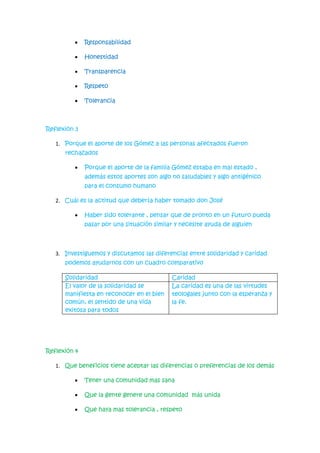 El primer documento presenta la situación de Paula, quien le pide dinero prestado a su amigo Camilo estando en estado de intoxicación. Se discuten diferentes formas en que Camilo podría haber manejado mejor la situación, como ofrecer pagar por un tratamiento de rehabilitación en lugar de darle dinero directamente. El segundo documento contiene reflexiones sobre los beneficios de filtrar información y los valores que Teresa debe considerar. El tercer documento analiza por qué los aportes de la familia Gómez fueron rechazados y la importancia de la solidaridad