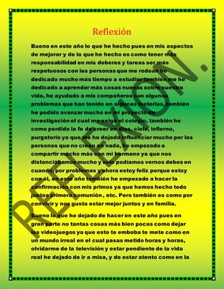 Este año, el autor ha mejorado su responsabilidad en los deberes y tareas, se ha vuelto más respetuoso, ha dedicado más tiempo al estudio y ha aprendido cosas nuevas. También ha ayudado a compañeros con problemas académicos y ha avanzado en su proyecto de investigación. Sin embargo, ha perdido la fe en Dios y la religión y se ha dejado influenciar por personas no creyentes.
