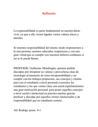 El documento discute la importancia de la responsabilidad y cómo está ligada a valores éticos y morales. Indica que al ser responsables se respetará a los demás, se será educado y se cumplirán los deberes diarios. Finalmente, el estudiante Rodrigo Posso se disculpa con el profesor Guillermo Mondragón por faltar a la responsabilidad y no completar los trabajos propuestos, a pesar de que las clases del profesor son valiosas y motivadoras.
