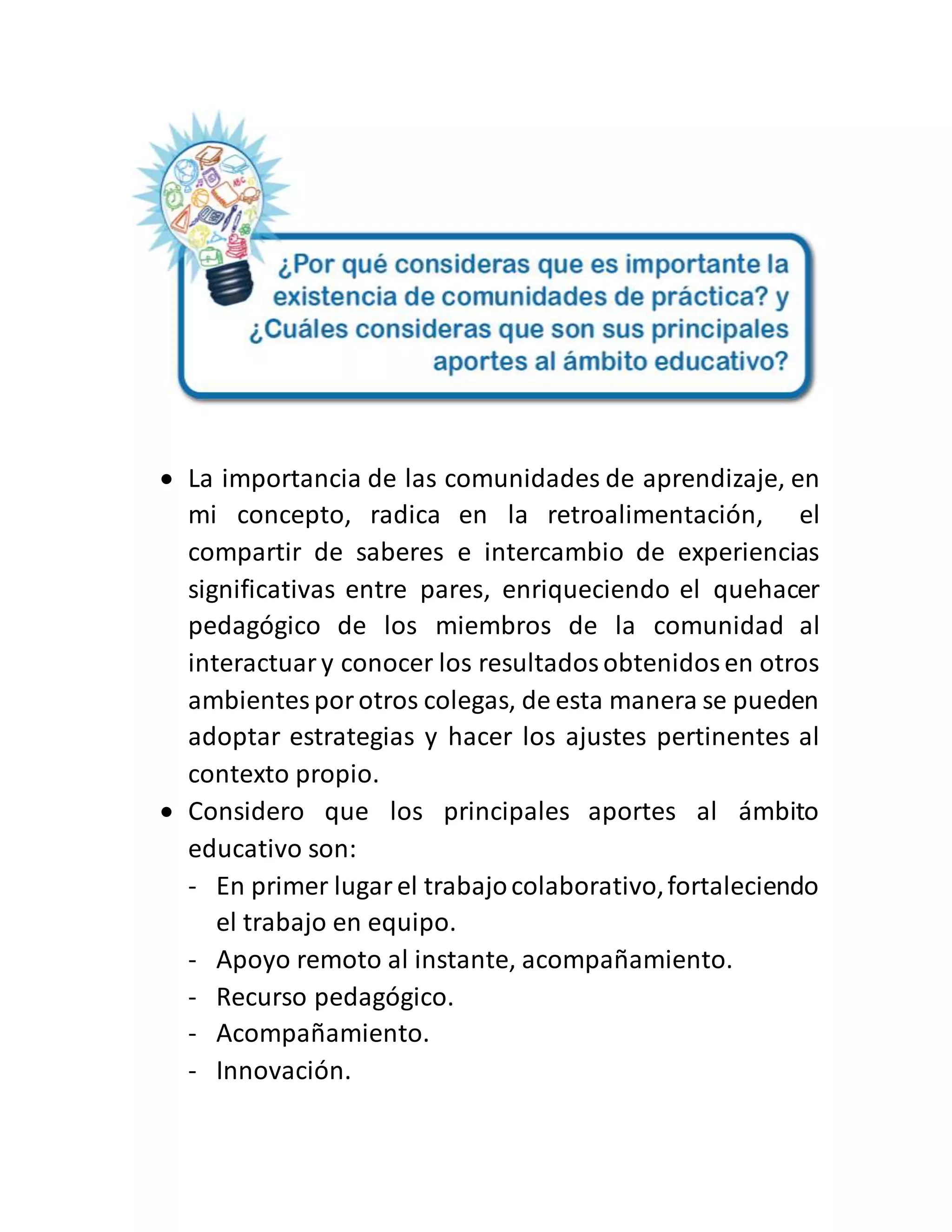 La importancia de las comunidades de aprendizaje radica en la retroalimentación y el intercambio de experiencias entre pares, lo que enriquece el trabajo pedagógico de los miembros al conocer resultados de otros colegas. Los principales aportes al ámbito educativo son el trabajo colaborativo y en equipo, el apoyo e intercambio remoto, el uso de recursos pedagógicos para la innovación y el acompañamiento.