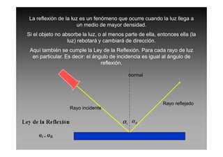 La reflexión de la luz ocurre cuando esta llega a un medio más denso y rebota, cambiando de dirección. Existen dos tipos de reflexión: especular en superficies lisas y difusa en superficies rugosas. Los espejos producen reflexión especular y pueden ser planos o curvos, siendo los parabólicos y esféricos los más importantes.