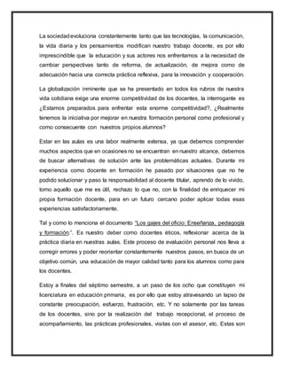 La práctica docente requiere de constante reflexión y mejora para enfrentar los retos de una sociedad en evolución. Los docentes deben actualizar sus conocimientos y enfoques para ofrecer una educación de calidad que prepare a los estudiantes para el futuro. La formación de nuevos maestros debe desarrollar competencias como la enseñanza crítica y el aprendizaje autoregulado para lograr estos objetivos.