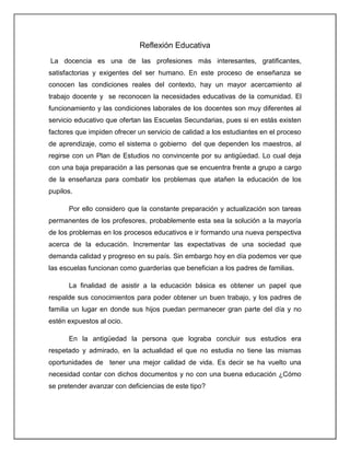 Este documento discute los desafíos de la enseñanza y la necesidad de actualización continua para los maestros. Señala que los factores como planes de estudio anticuados y falta de preparación dificultan que los maestros brinden una educación de calidad. También sugiere que las escuelas a menudo funcionan más como guarderías que como instituciones educativas. Concluye que se requiere un esfuerzo colectivo de padres, maestros y autoridades para mejorar la organización educativa y satisfacer las demandas de una sociedad por