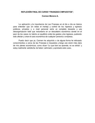 La autora reflexiona sobre la importancia de las finanzas y los impuestos para entender los ingresos, egresos y gastos a nivel personal, privado y público y mantener el equilibrio entre ellos. El curso de Finanzas e Impuestos que completó le permitió adquirir nuevos conocimientos sobre estos temas y tener una visión más clara para la planificación de sus objetivos económicos.