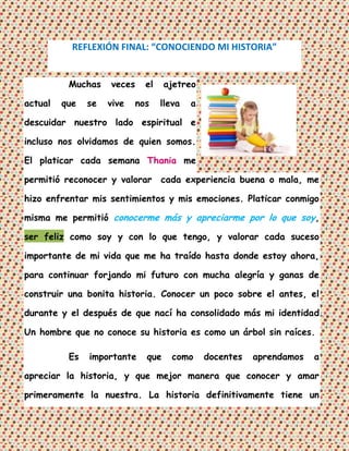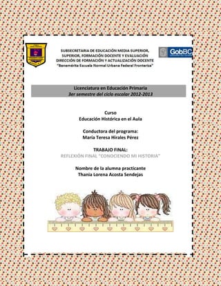 Este documento presenta la reflexión final de una alumna practicante llamada Thania Lorena Acosta Sendejas sobre el curso de "Educación Histórica en el Aula". La reflexión destaca cómo el conocer su propia historia le permitió apreciarse a sí misma y valorar sus experiencias pasadas para construir un mejor futuro. También enfatiza la importancia de que los docentes aprendan a apreciar la historia para poder enseñarla de manera significativa a través de estrategias didácticas como cuentos y juegos que promuevan el