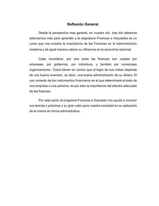 El documento describe la importancia del curso de Finanzas e Impuestos. El curso enseña la importancia de las finanzas en la administración moderna y su influencia en la economía nacional. Tanto empresas, gobiernos, individuos y organizaciones usan las finanzas y el logro de sus metas depende de una buena inversión y administración de dinero. El programa ayuda a conocer las teorías y prácticas financieras y su valor para la sociedad.