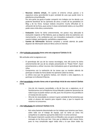 El estudiante encuentra lo más interesante de la asignatura Educación y Sociedad la relación entre esta y el uso de las nuevas tecnologías en la enseñanza. Expresa interés en aprender sobre el uso de las TIC en el aula y sobre la comunicación entre la escuela y las familias. Señala como áreas motivadoras los derechos humanos, las TIC en educación, y la relación entre tutores y familias. Sus actitudes incluyen aprender sobre herramientas tecnológicas motivadoras y participar activamente. Sus necesidades son familiar