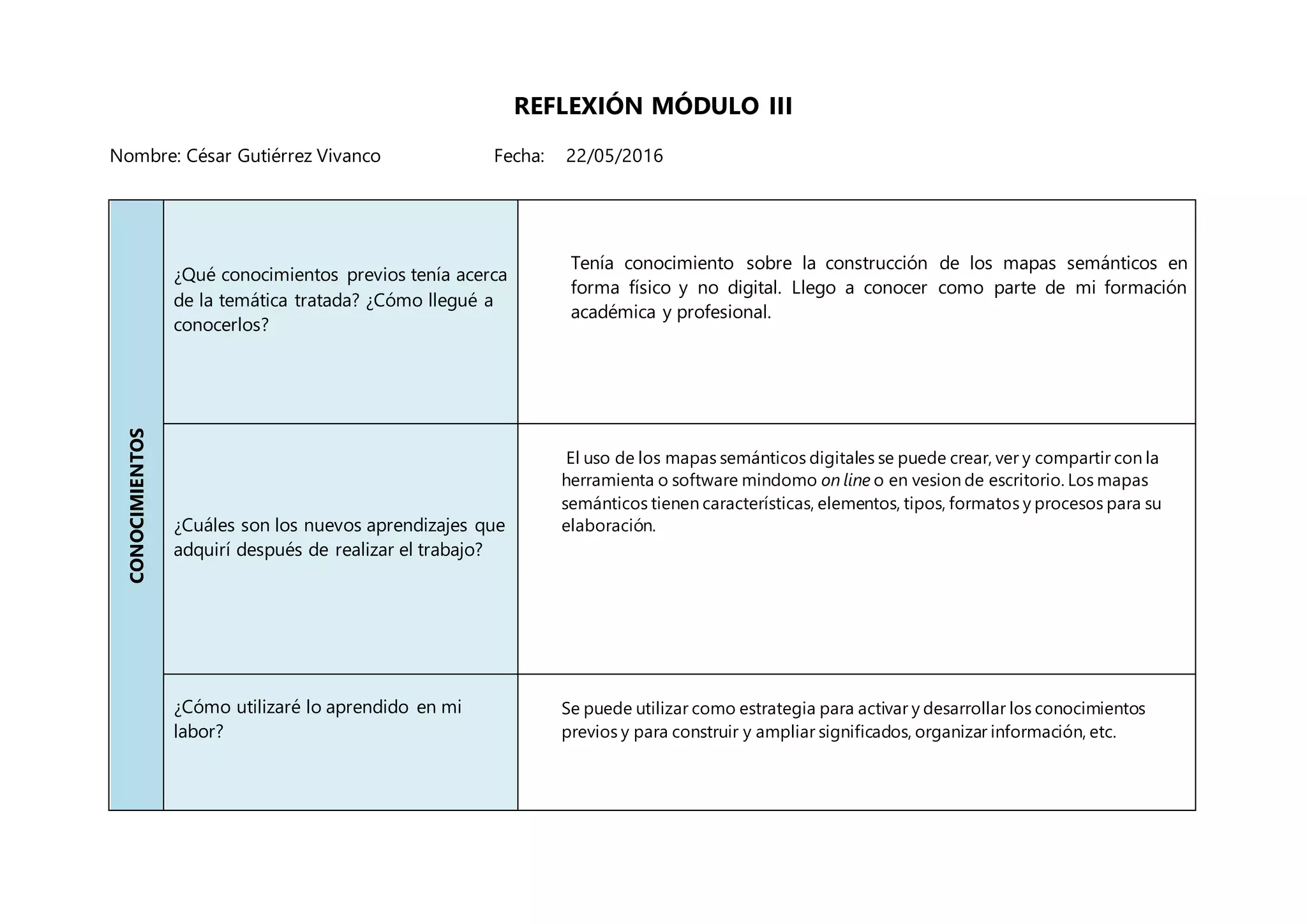 César Gutiérrez Vivanco realizó una reflexión sobre el Módulo III. Tenía conocimiento previo sobre mapas semánticos físicos de su formación académica. Aprendió que los mapas semánticos digitales se pueden crear y compartir con la herramienta Mindomo. Puede utilizar los mapas semánticos como estrategia para organizar información. Realizó el mapa de forma individual aunque invitó a dos colegas. Identificó que la ventaja de Mindomo es que es práctico y gratuito, a