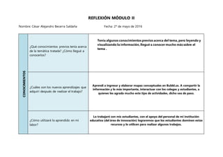 César aprendió a crear mapas conceptuales en Bubbl.us a través de este módulo. Planea enseñar esta habilidad a sus estudiantes con el apoyo de su escuela. Reconoce que necesita mejorar su participación siendo más preciso, puntual y dedicado, aunque la falta de tiempo y cobertura de internet son limitaciones. Considera que la metodología propuesta le ayudó a aprender a pesar de las desventajas de la velocidad de internet.