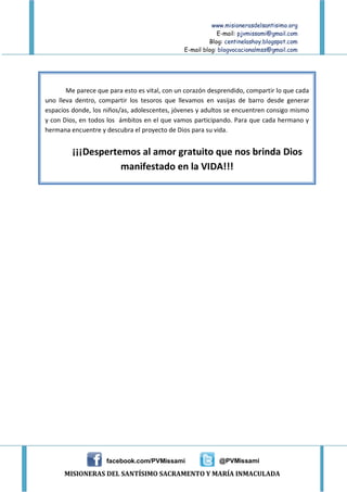 Pascuala Tola Coca describe la vocación como un regalo de Dios que invita a percibir su amor en la creación. Ella experimentó este llamado a través de su familia y comunidad, y confirmó su vocación al unirse a las Misioneras del Santísimo Sacramento. Ella enfatiza la importancia de compartir generosamente nuestras experiencias para ayudar a otros a descubrir el plan de Dios para sus vidas a través de espacios de encuentro donde puedan conectarse con Dios y consigo mismos.