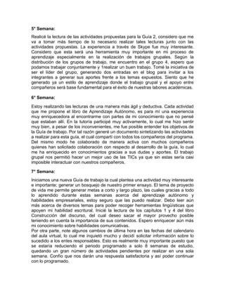 Este documento resume las 10 semanas de estudio de un programa a distancia. El estudiante describe su progreso en adaptarse al nuevo horario, familiarizarse con las guías de estudio, desarrollar métodos de estudio efectivos, y mejorar sus habilidades comunicativas y de trabajo en equipo. A lo largo del programa, el estudiante muestra un compromiso creciente con su aprendizaje y logra resultados positivos en las evaluaciones. Finalmente, reflexiona que ha adquirido importantes herramientas que le permitirán aplicar lo aprendido en el campo