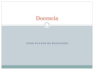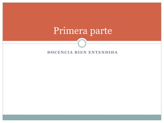 Este documento presenta reflexiones sobre la docencia bien entendida. En 3 oraciones: Ofrece una visión de la docencia como vocación, no como trabajo, y destaca la importancia de virtudes como la veracidad, la estudiosidad y el amor a los alumnos. También enfatiza la necesidad de ser justo y ejercer la autoridad de manera equilibrada con la misericordia. El objetivo es formar integralmente a los estudiantes.