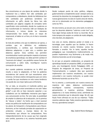 Este documento describe los cambios en las tendencias educativas debido a la incorporación de las tecnologías de la información y la comunicación (TIC) en la enseñanza. Señala que los docentes deben adaptarse a estos cambios y utilizar las TIC para implementar proyectos pedagógicos de manera más dinámica. Concluye que los maestros deben continuar actualizando sus concepciones y prácticas para adaptarse a la nueva dinámica social requerida por la educación.