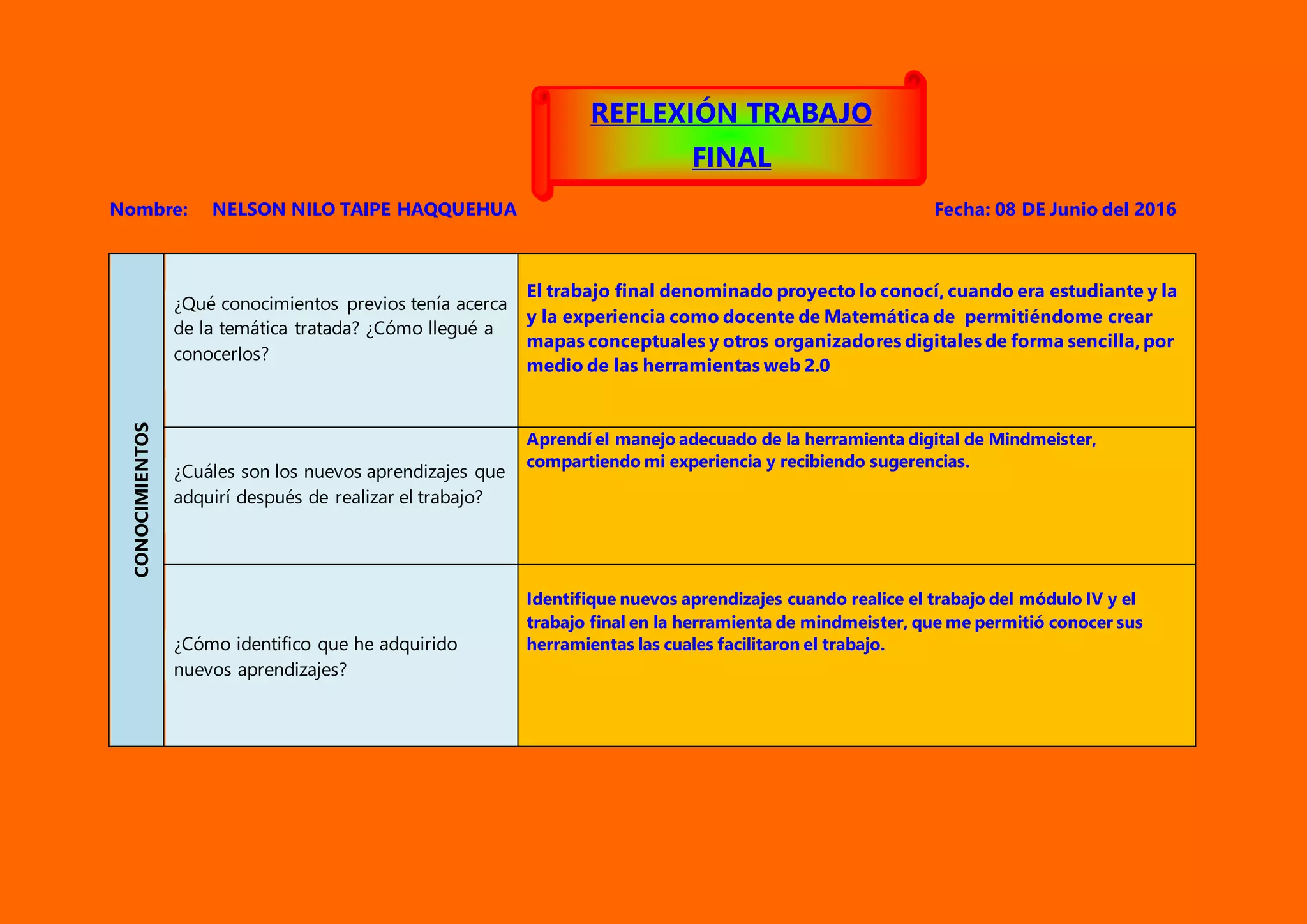 Este documento resume la reflexión de un estudiante sobre su aprendizaje y participación en un proyecto educativo. El estudiante aprendió a usar la herramienta Mindmeister para crear mapas conceptuales y organizadores digitales. Reconoció que podría aplicar estas habilidades en proyectos educativos con su comunidad estudiantil. Participó activamente en foros dando comentarios sobre el trabajo de sus compañeros. Identificó ventajas en el uso de Mindmeister y Slideshare para su proyecto sobre matemática financiera.