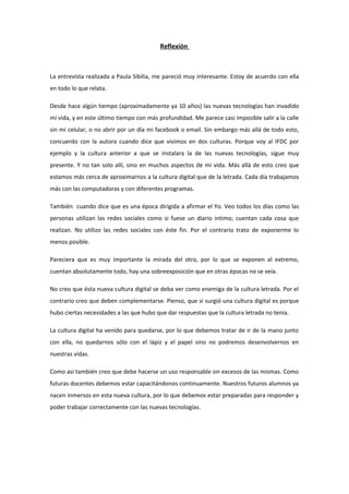 La persona está de acuerdo con las opiniones de Paula Sibilia sobre cómo las nuevas tecnologías han invadido su vida en los últimos 10 años, pero que aún coexisten con la cultura anterior. Además, cree que estamos más cerca de la cultura digital que de la cultura letrada tradicional debido al uso cada vez mayor de computadoras. Finalmente, señala que la cultura digital ha venido para quedarse y que debemos complementarla con la cultura letrada en lugar de verla como enemiga, y hacer un uso responsable de la tecnología.