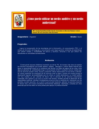 Este documento describe cómo un profesor puede utilizar medios auditivos y audiovisuales en el aula para mejorar el aprendizaje de los estudiantes. El profesor puede proyectar libros u otros recursos didácticos, presentar videos relacionados con los temas, y mostrar los productos de los estudiantes a la clase. Estos medios atraen más la atención de los estudiantes y permiten desarrollar capacidades auditivas, visuales y kinestésicas al crear un ambiente interactivo donde los estudiantes pueden escuchar, ver y participar.