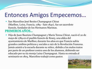 Marcelino José Benito Champagnat nació en 1789 en Francia. Nunca asistió a la escuela de niño debido a malos tratos, y fue educado por su tía monja. En 1804, un sacerdote lo reconoció y le dijo que debía estudiar latín y convertirse en sacerdote, lo que marcó un punto de inflexión en su vida. Más tarde, fundó la orden religiosa de los Hermanos Maristas para educar a los niños.